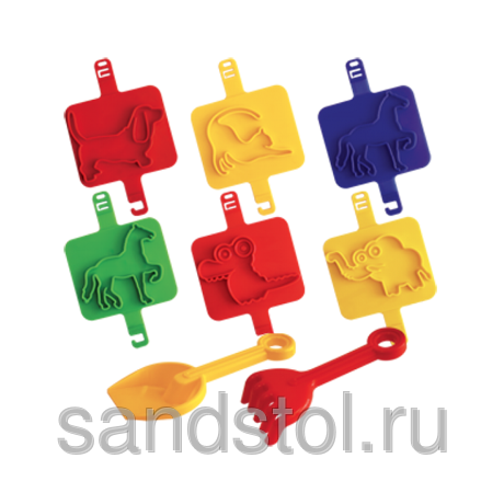 Набор для игры с кинетическим песком, состоящий из лопатки, граблей и 6 плоских формочек с изображениями животных позволит малышу не просто играть с песком, но и запоминать, узнавать и называть животных